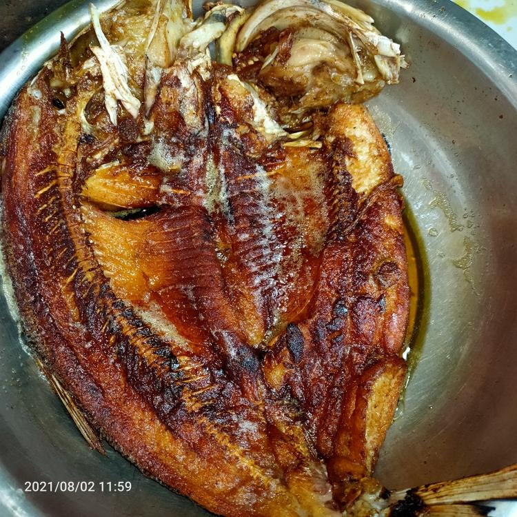 鱼的表面和背面撒一层干面粉 会更酥脆 锅热多放一点油 油热下鱼 中火煎 不要过早动鱼 要来回动锅 剪到鱼不沾锅 图片这种焦焦状态 翻面 同样方法煎 两面煎好 然后捞出来 (如果家里的锅小 那鱼要买小一点 不然会烂)