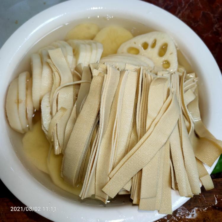 放自己喜欢的蔬菜 切厚片备用 可以放土豆 藕 豆皮 腐竹 金针菇 蘑菇 香菇 黄瓜 小青菜 都可以