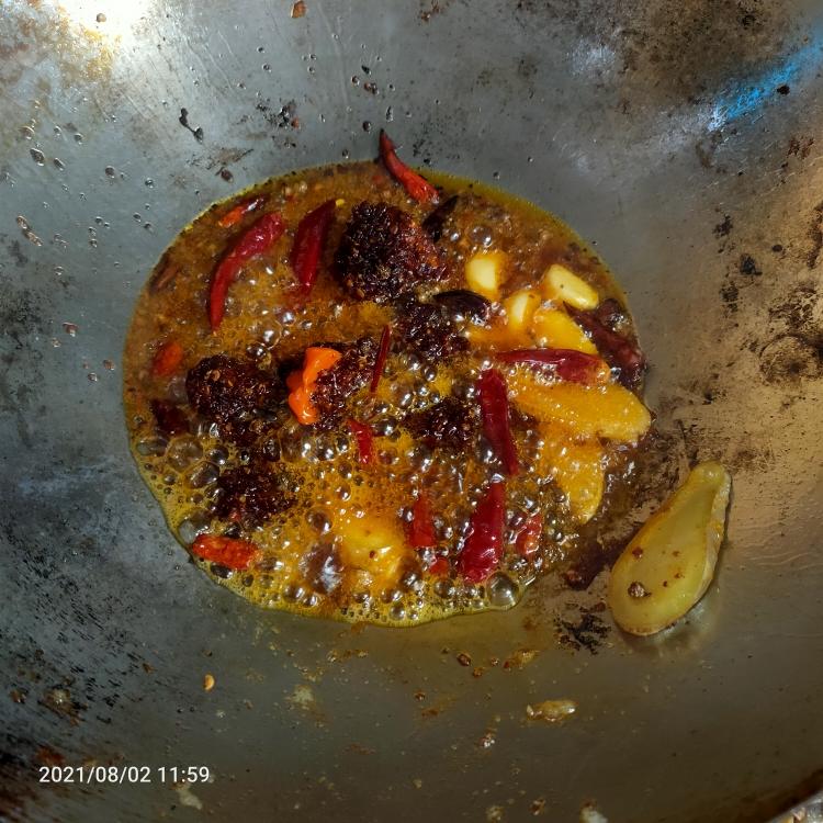 干辣椒花椒 生姜片 大蒜 火锅底料 下锅小火炒一分钟 倒入一瓶啤酒 一碗水 大火煮开