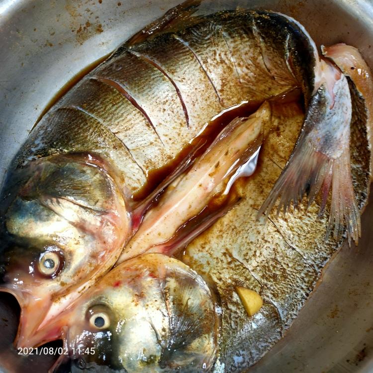 鱼的两面来几刀 撒一点盐 抹匀生姜切丝 放鱼的下面上面 多一点料酒 一点生抽 两面都撒一点孜然 腌半个小时 时间越长越入味
