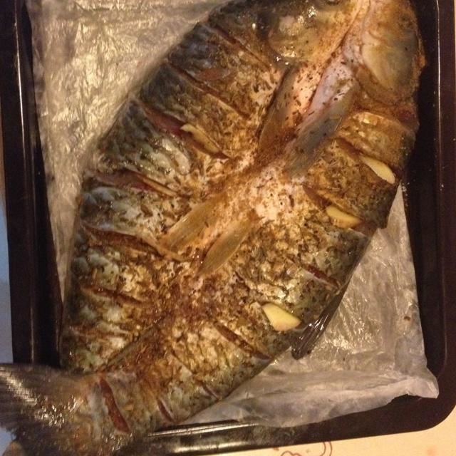 将两斤重左右草鱼,清理后,花上几条纹路,对剖,趴放到烤盘中。用料酒把少许盐融化,均匀涂抹整个鱼身,头和尾多涂几遍。在把孜然粉均匀洒满整个鱼身。然后放烤箱180度上下火烤20分钟,打开观察看鱼表皮如没微焦,可往上层移动后在烤2分钟。考好后把盘中水一定倒干净。保持无水干燥。