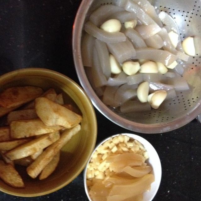 魔芋切条状后,和大蒜一起过水,蒜多煮一会,略软捞起晾干水分。泡萝卜切条老姜剁姜米备用。