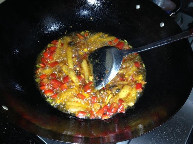 颜色,从金黄刚变深后再放适量孜然后依次加入土豆条,魔芋,豆皮。