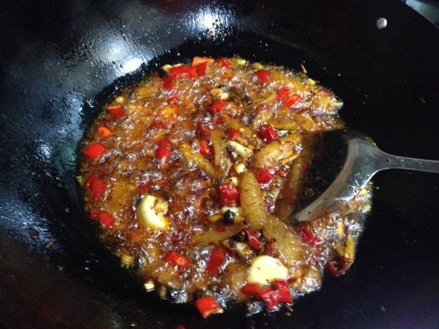 植物油量多一些,八成热,将豆瓣酱,豆豉倒入边抄,金黄后放入蒜,姜米,酸萝卜条。