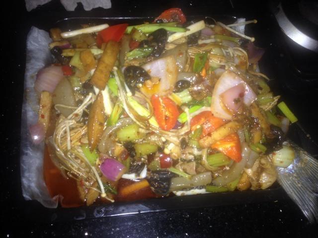 鱼烤好后,将料浇盖在鱼上后,再进烤箱150度烤5至8分钟